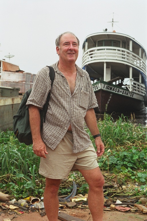 | Dirk Wyle on the Amazon (Rio Negro at Manaus, Amazonas, Brazil) in front of "Regional Cargo Boat" of the type that took Ben and Rebecca up river in Amazon Gold. |